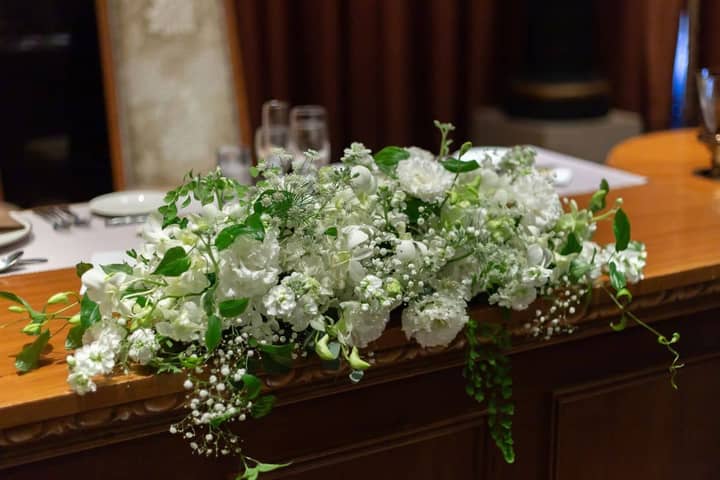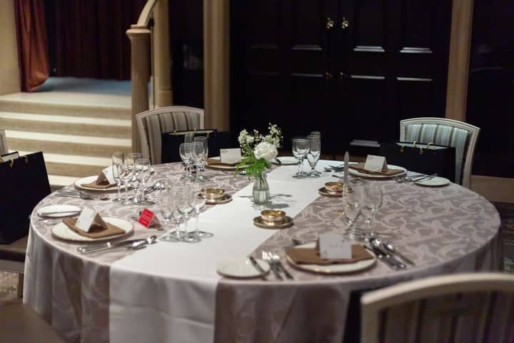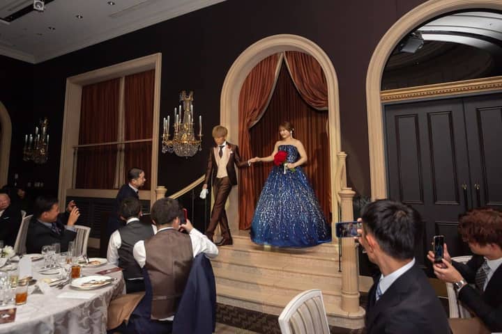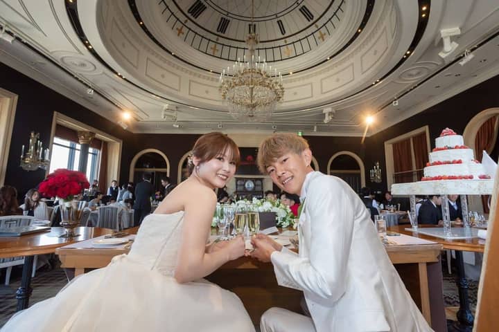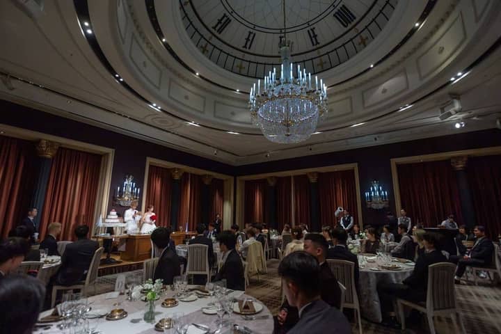 披露宴を行った『グリニッジホール』は、大人っぽくてカッコイイ色合いの会場です。天井には大きな時計とシャンデリアがあり、非日常感を味わえる空間でした。